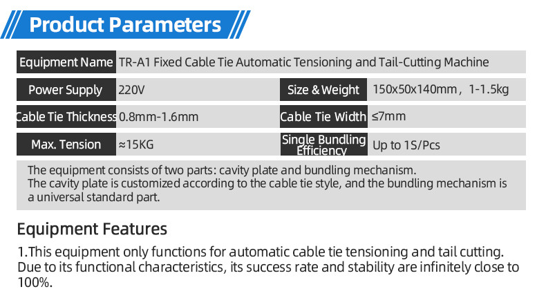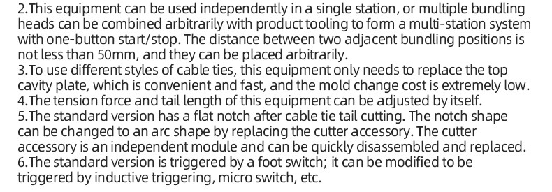 1.This equipment only functions for automatic cable tie tensioning and tail cutting. Due to its functional characteristics, its success rate and stability are infinitely close to 100%.