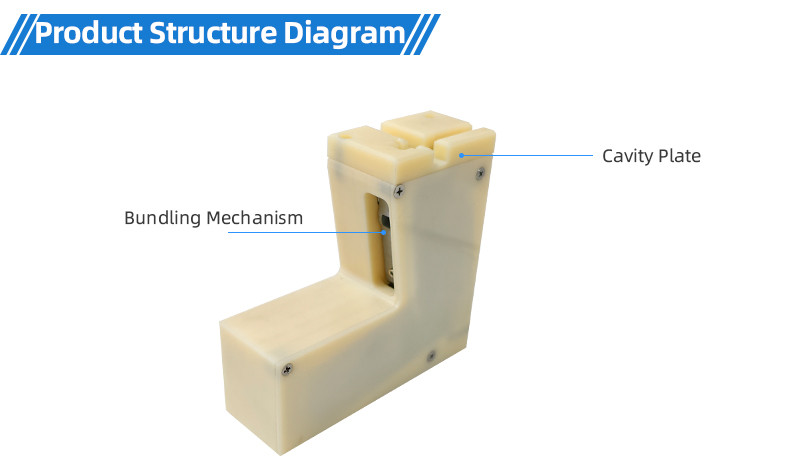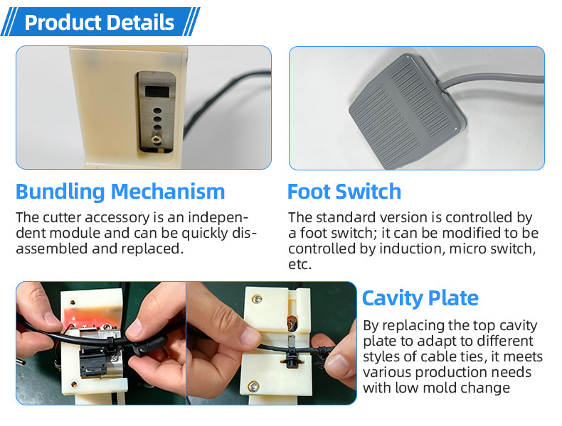 The equipment consists of two parts: cavity plate and bundling mechanism. The cavity plate is customized according to the cable tie style, and the bundling mechanism is a universal standard part.
